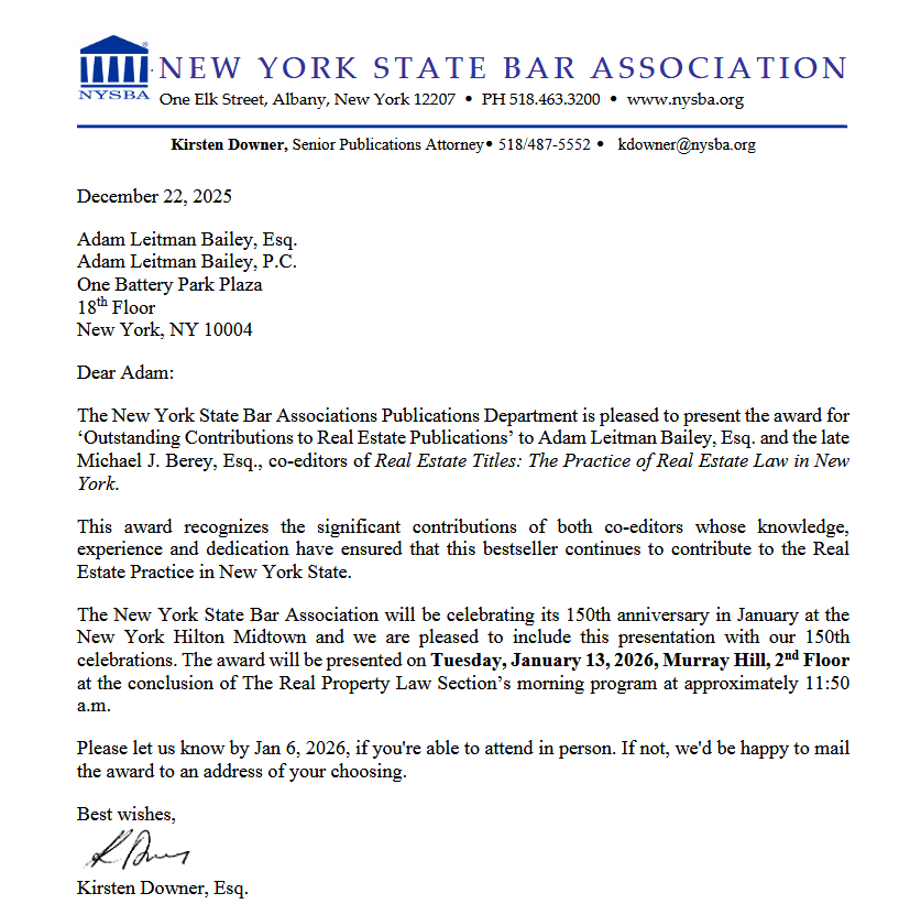 Print this page Email this page Adam Leitman Bailey and Mike Berey are Recognized by the New York State Bar Association for their ‘Outstanding Contributions to Real Estate Publications’ Adam Leitman Bailey New York State Bar Association