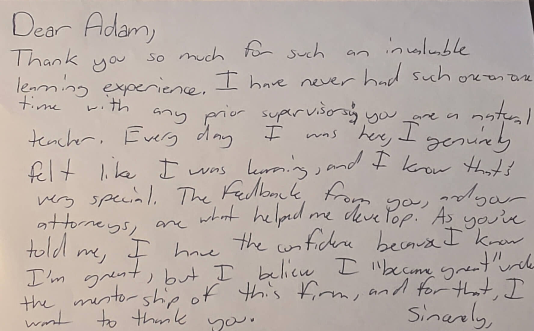 “I believe I “become great” under the mentorship of this firm, and for that I want to thank you”