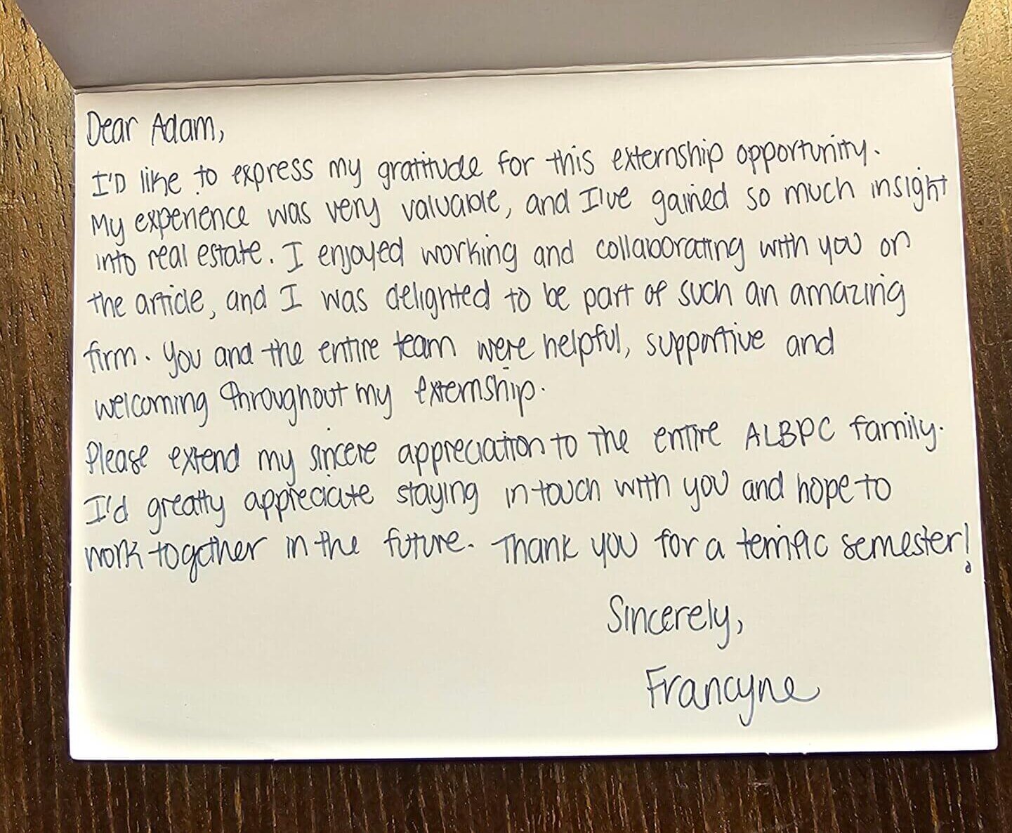 I’d like to express my gratitude for this externship opportunity. My experience was very valuable, and I’ve gained so much insight into real estate. I enjoyed working and collaborating with you on the article, and I was delighted to be part of such an amazing firm. You and the entire team were helpful, supportive and welcoming throughout my externship.